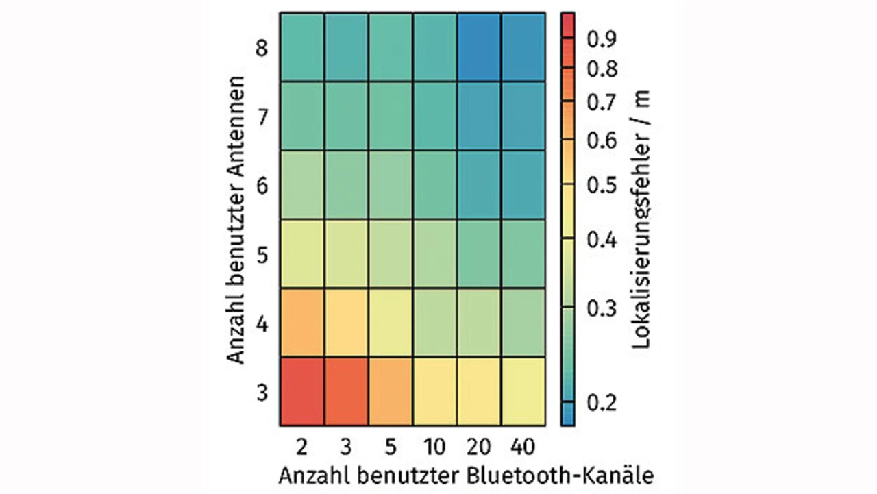 Ein Überblick über diese Analyseergebnisse unter Verwendung des oben vorgestellten JADE-MUSIC-Algorithmus [6] gibt Bild 8. Zu sehen ist jeweils der Median des Lokalisierungsfehlers bei verschiedenen Konfigurationen. Werden alle acht Antennen verwendet, ergibt sich ein Medianfehler von 22 cm bei ausschließlicher Verwendung der drei Bluetooth-Advertising-Kanäle. In der Praxis ist diese Kanalauswahl von großem Vorteil, da so verbindungslos gearbeitet werden kann, ohne die Bluetooth-Spezifikation zu verletzen.