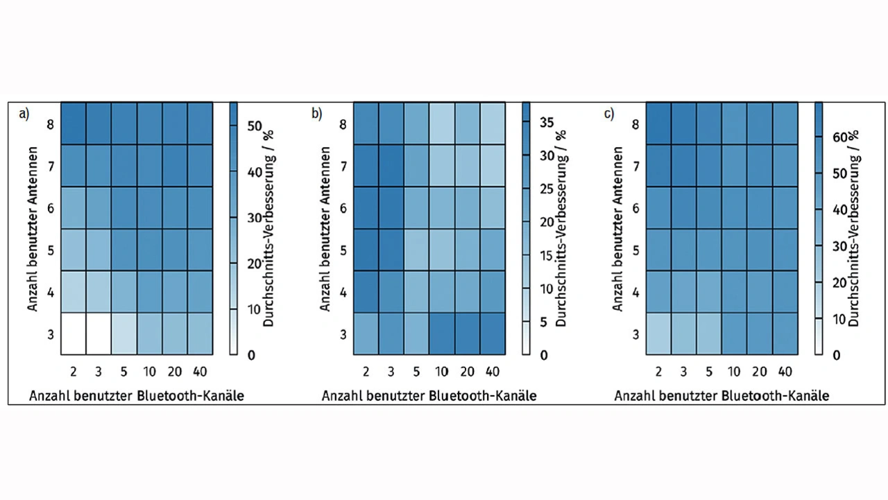 Eine weitere Steigerung der Lokalisierungsqualität ist durch Verwendung des JADE-MUSIC-Algorithmus möglich. Zunächst zeigt Bild 9b die Unterschiede zum MUSIC-Algorithmus. Hier ist auffällig, dass insbesondere für kleine Kanalanzahlen, d. h. bei ausschließlicher Verwendung der Bluetooth-Advertising-Kanäle, deutliche Verbesserungen von etwa 30 % erzielt werden können.