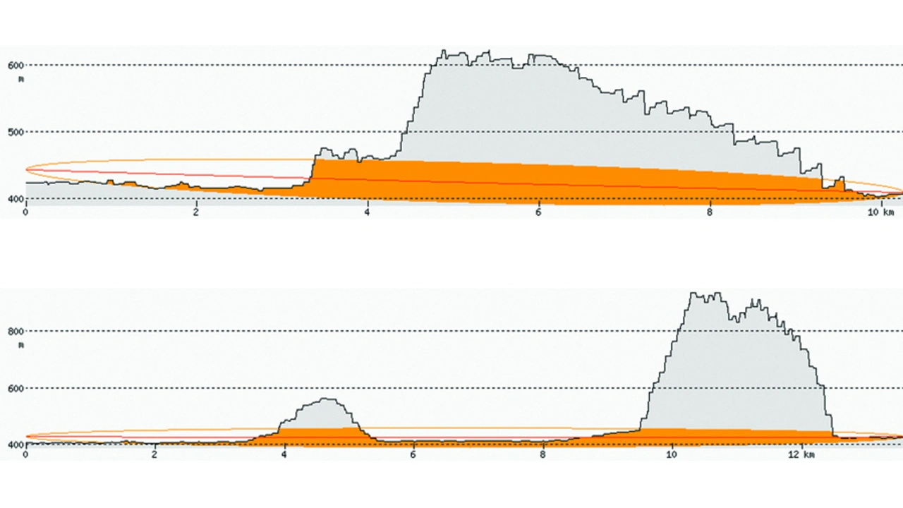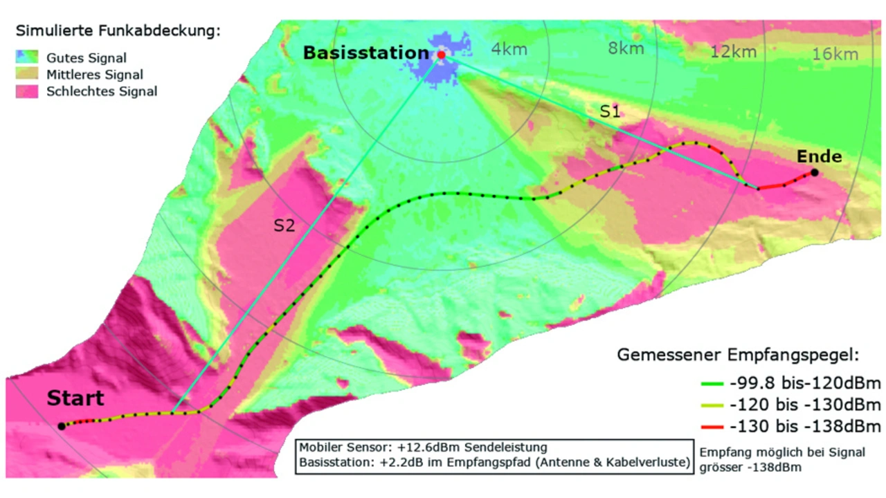 Zwei Geländequerschnitte mit Basisstation und Messpunkt illustrieren die herausfordernden Messbedingungen (S1 und S2 in Bild 5 und 7).