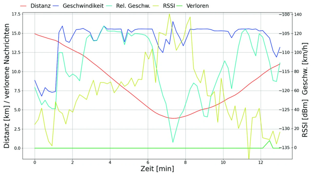 Auch in Zonen, in denen Simulationen eine schlechte Funkabdeckung nahelegen, wurde bei einer Messfahrt mit Sendern in bewegten Fahrzeugen eine gute Funkverbindungen gemessen. Sie sind in den grün und gelb markierten Fahrtabschnitten in den roten Zonen in Bild 5 markiert.Auch in Extrembereichen mit hohen Abständen des Fahrzeugs zur Basisstation und niedrigen RSSI-Werten können mit Mioty bei hohen relativen Geschwindigkeiten des Fahrzeugs zur Basisstation noch Signale empfangen werden (Bild 6).
