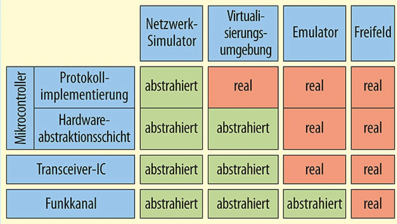 Ebenen konsistent zu halten. Wenn also ein Fehler im Simulationsmodell gefunden und korrigiert wird, dann bleibt er oftmals in der realen Implementierung noch bestehen, und umgekehrt. Außerdem kann die Simulationsebene nicht dazu genutzt werden, um Fehlverhalten, das in der realen Hardware-Implementierung beobachtet wurde, auf der Simulationsebene für eine detailliertere Analyse nachzustellen. Am Institut für verlässliche Embedded Systems und Kommunikationselektronik der Hochschule Offenburg wurde ein durchgängiger Implementierungs- und Verifikationsansatz für Funknetzwerke entwickelt, der über vier Abstraktionsebenen hinweg eingesetzt werden kann (Bild 1).