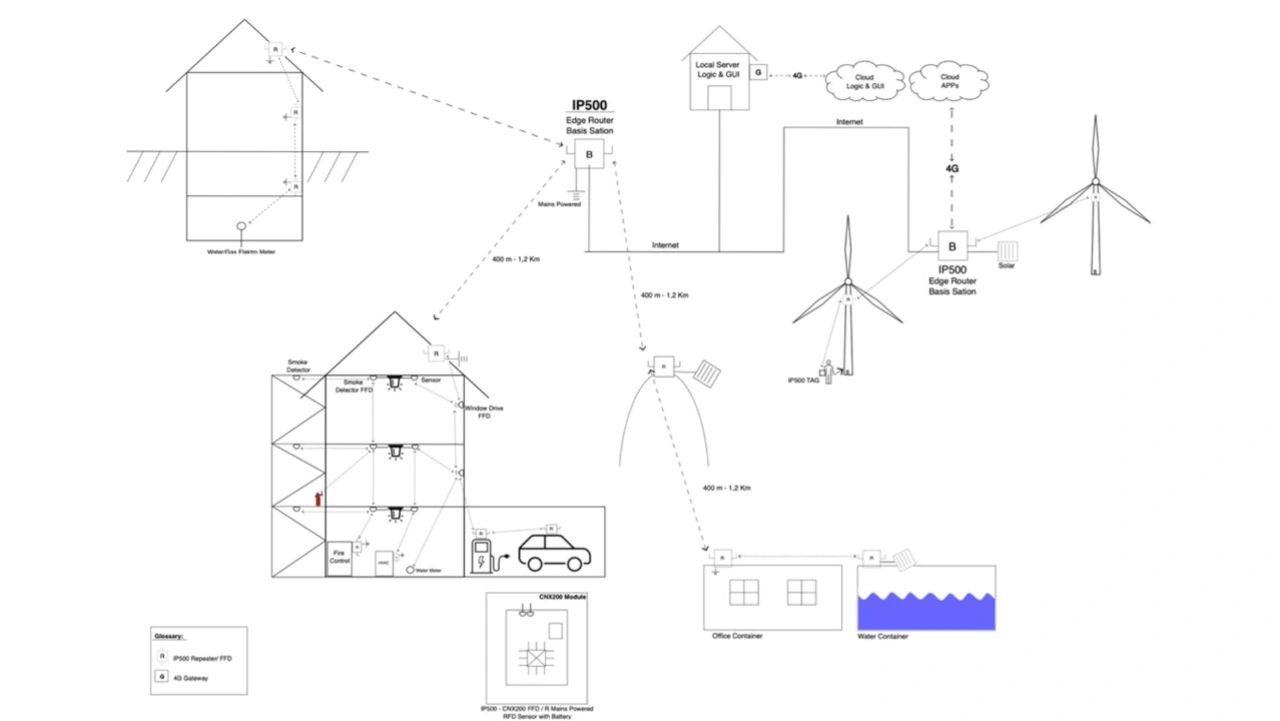 Auf diese Weise ebnet der IP500-Standard den Weg für die Smart Cities von morgen, in denen integrierte, per Funk kommunizierende IoT-Systeme nachhaltige, vernetzte Gemeinschaften schaffen. Endgeräte wie Wasser- und Gaszähler, Ladestationen und komplexe Systeme wie Gebäude-Automatisierungen können über ein und dasselbe Funknetzwerk kostengünstig, sicher und in Echtzeit Daten übertragen (Bild). Dank der Skalierbarkeit und Flexibilität bietet sich der IP500-Standard als zentraler Baustein für eine zukunftsorientierte, ESG-konforme (ESG: Environmental, Social and Governance) Infrastruktur an.
