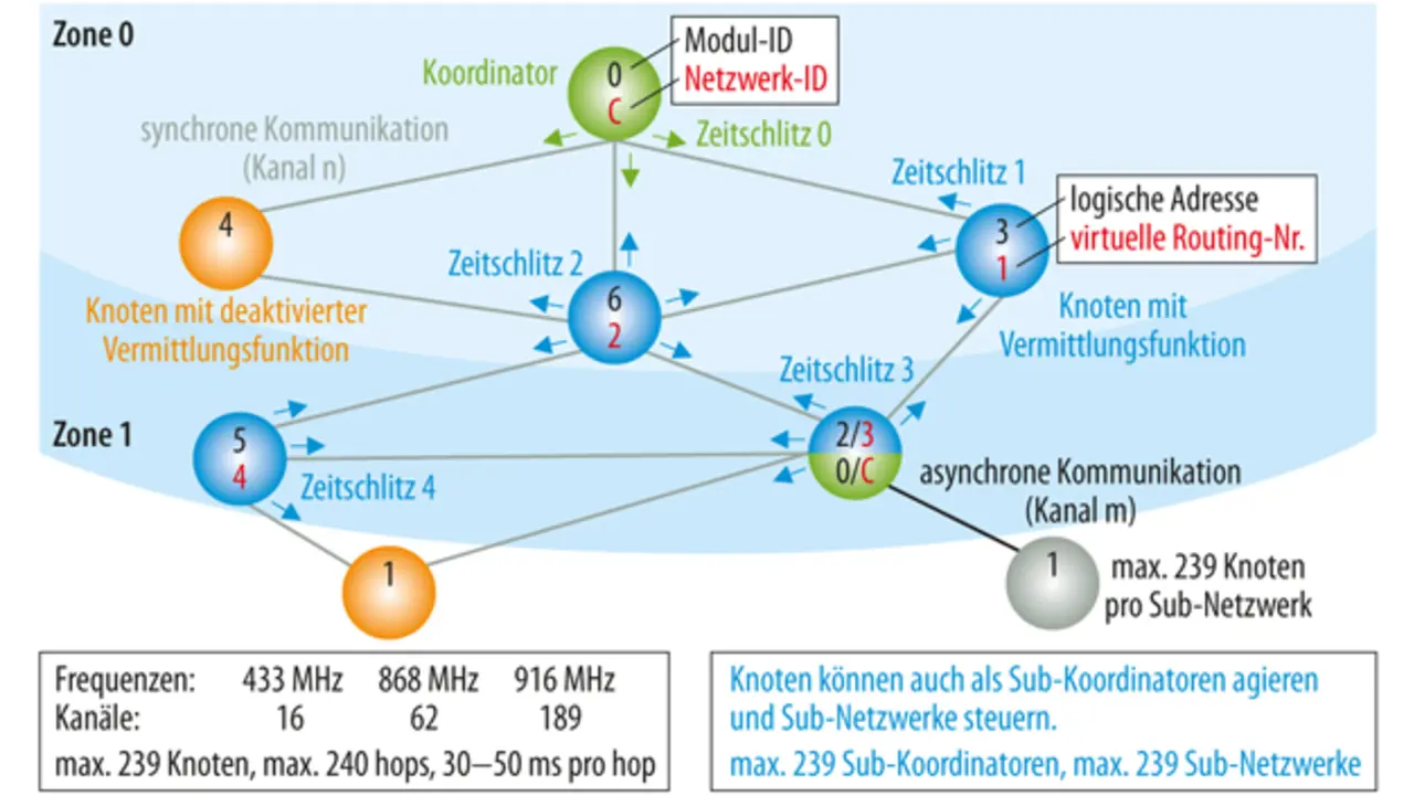 Mit Hilfe des Protokolls DPA (Direct Peripheral Access) [2], das die Steuerung der Transceiver durch Daten im vorgeschriebenen Format vereinfacht, ist es möglich, Netzwerke mit bis zu 239 Knoten zu bilden.