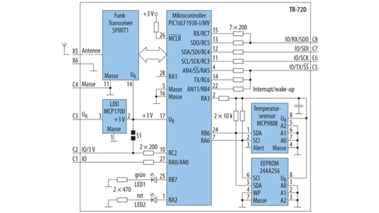 Auf der Hauptplatine des Transceiver-Moduls befindet sich ein Mikrocontroller, ein externes EEPROM, eine Kontroll-Leuchtdiode (rot, grün), sechs E/A-Anschlüsse und fakulativ ein Temperatursensor, eine Antenne als Leiterbahn oder ein Antennenanschluss (Bild 2).