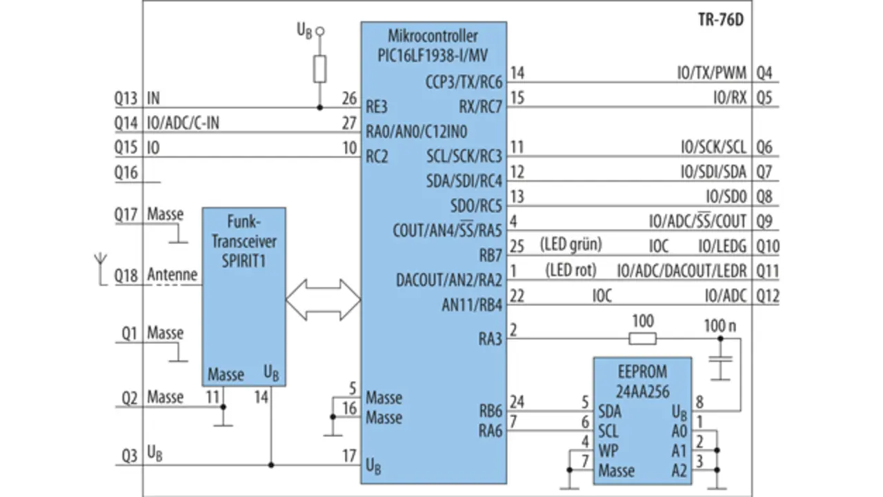 Im Unterschied zum Transceiver-Modul TR-72D bietet das Transceiver-Modul TR-76D zwölf E/A-Anschlüsse (Bild 3). Das Transceiver-Modul TR-76D ist für den Betrieb an einer Betriebsspannung im Bereich von 3,0 V bis 3,4 V ausgelegt.