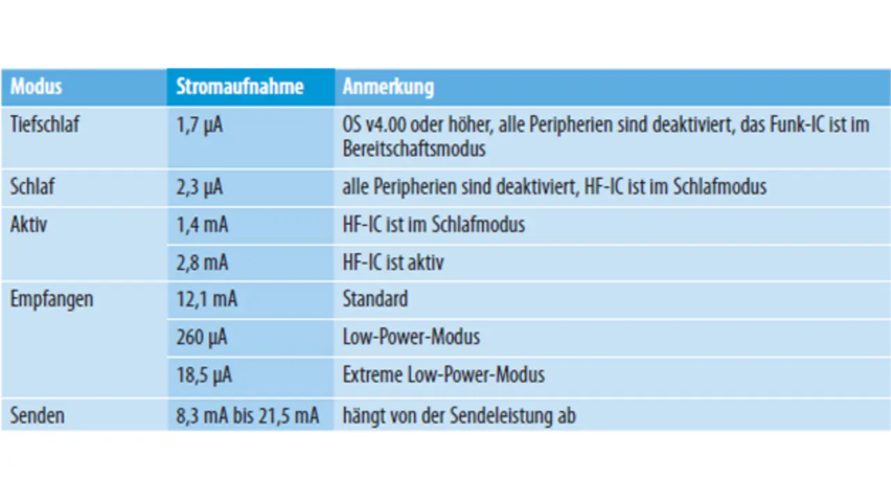 Ein IQRF-Transceiver kann in verschiedenen Betriebsmodi arbeiten. Davon ist auch seine Stromaufnahme abhängig (Tabelle 1).