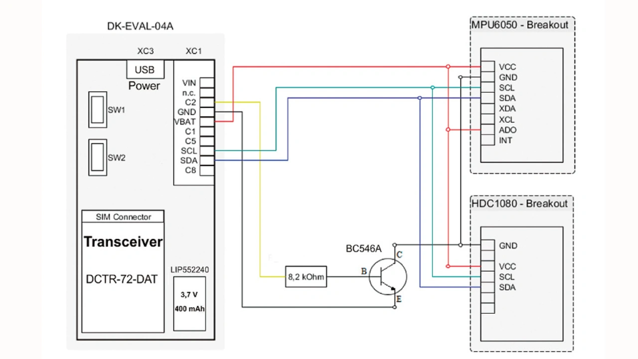 Um Energie zu sparen, wird der Temperatursensor des IQRF-Transceivers deaktiviert. Die Spannungsversorgung für die beiden Breakout Boards mit den Sensoren kann vom IQRF-Transceiver über einen Transistor komplett abgeschaltet werden. Auch wenn die Sensoren selbst recht genügsam in der Leistungsaufnahme sind, befindet sich auf den Breakout Boards zusätzlich noch Peripherie – Widerstände, LDO –, die auch im Schlafmodus der Sensoren circa 1 mA Strom aufnehmen.