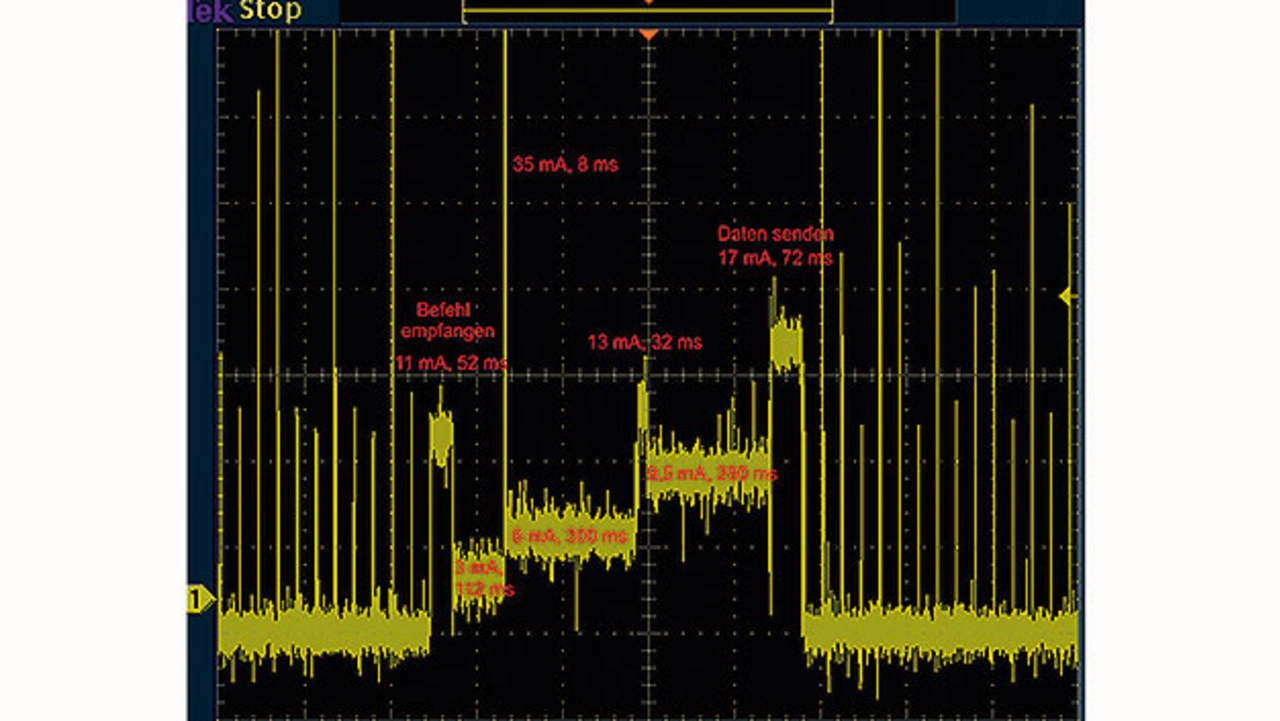 Der Energiebedarf der Sensorknoten hängt von der momentanen Aktivität ab und ist beim Senden mit 4 mWs (17 mA) am höchsten und im Bereitschaftsbetrieb mit ca. 0,1 mWs (0,37 mA) am geringsten. Dazwischen bewegen sich die Werte für die weiteren Schritte wie etwa Initialisierung, Kalibrierung und Messung, die der Funktransceiver und die angeschlossene Elektronik durchlaufen. In Bild 10 ist die Stromaufnahme für einen kompletten aktiven Zyklus (856 ms) gezeigt.