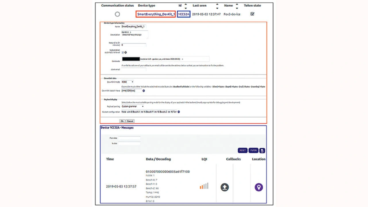 Der IQRF-Coordinator im IQRF-Sigfox-Gateway sammelt jede Stunde die Messwerte aller drei Sensorknoten, die automatisch mit einem Zeitstempel versehen werden, verarbeitet diese und sendet sie jeweils als 12 Byte große Nachricht über Sigfox in die Sigfox-Cloud. Zuvor ist das jeweilige Sigfox-Gerät auf der Sigfox-Website (https://buy.sigfox.com/activate) zu registrieren, wofür dem Fox-3-Modul ein Zettel mit einem Registrierungscode beiliegt. Nach erfolgreicher Registrierung kann die Sigfox-Cloud mit dem angegebenen Modul ein Jahr lang kostenlos genutzt werden. Für ein einzelnes Sigfox-Gerät sind üblicherweise 21 Euro pro Jahr zu entrichten.