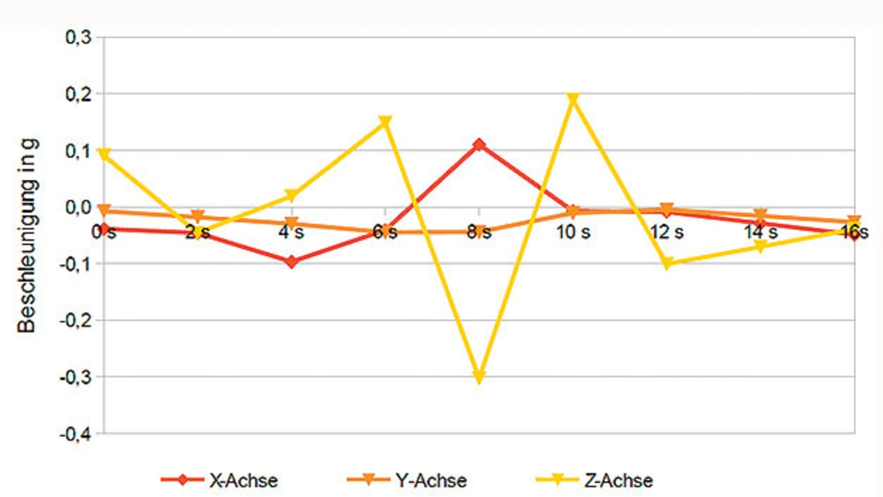 Ein Hüpftest (Bild 13) auf der Fußgängerbrücke des TUHH-Privatgeländes führte zu einwandfrei detektierbaren Signalen, wie es im Bild 10 insbesondere am Signal der Z-Achse (Richtung der Erdbeschleunigung) zu erkennen ist. Das Messintervall beträgt dabei nur mehrere Sekunden, was in der Sigfox-Cloud nicht darstellbar wäre, weshalb diese Messwerte direkt aus der IQRF-IDE gewonnen wurden. Gemäß einer »vorausschauenden Wartung« werden die Ergebnisse in der Sigfox-Cloud als Tendenzen über größere Zeiträume dargestellt, d.h. Werte, die aus einer derartigen kurzzeitigen Belastung resultieren, gehen dabei nicht mit ein.