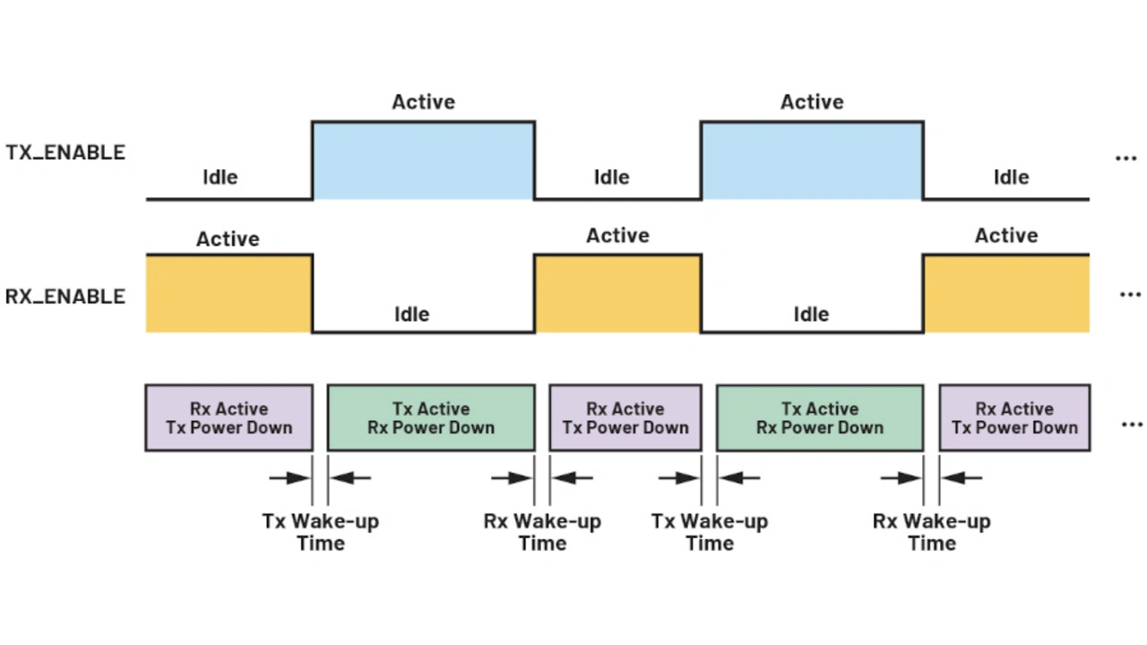 Anders als die statischen Energieeinsparungen auf Komponentenebene, sind die Energieeinsparungen auf Kanalebene dynamisch. Sie wurden speziell für TDD-Anwendungen entwickelt. Wie in Bild 5 gezeigt, sind Sende- und Empfangsaktionen miteinander zeitlich gemultiplext. Wenn ein Kanal aktiv ist, dann ist der andere inaktiv und kann abgeschaltet werden, um die Leistungsaufnahme weiter zu senken. Anders als die Energieeinsparungen auf Komponentenebene, gibt es beim Abschalten des inaktiven Kanals keine Leistungseinbußen, aber es dauert länger, ihn für den normalen Betrieb wieder aufzuwecken.