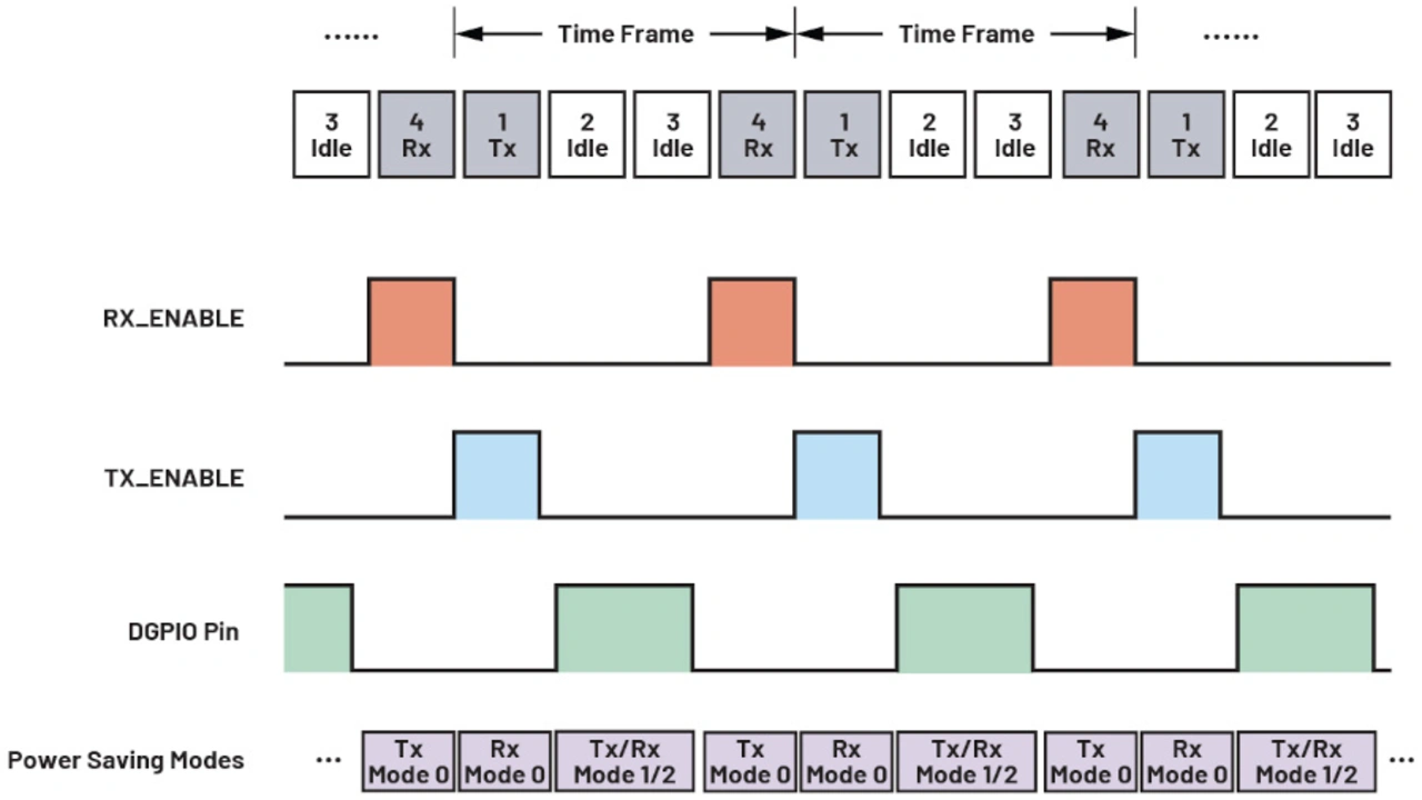 Bild 6 zeigt ein Beispiel für den Einsatz eines DGPIO-Pins zum triggern der Energiespar-Modi 1 und 2. In diesem Beispiel ist die gesamte TDD-Zeitspanne in mehrere Zeitrahmen aufgeteilt, wovon jeder aus vier Zeitschlitzen besteht. Der erste ist ein Sende-Zeitschlitz, gefolgt von zwei Ruhe-Zeitschlitzen und der letzte ist der Empfangs-Zeitschlitz. Standardmäßig ist Mode 0 immer aktiviert. Deshalb kann hier die DGPIO-Pin-Methode verwendet werden, um die Energiesparmodi 1 und 2 zu triggern und größere Einsparungen zu erreichen als nur Mode 0 allein.