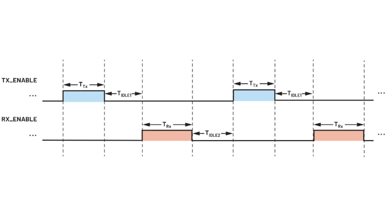 Bild 7 zeigt eine allgemeine TDD-Timing-Konfiguration. TTx und TRx stehen dabei für die aktive Sende- bzw. Empfangszeit. TIdle1 und TIdle2 bezeichnen die Ruhezeit. Zur Vereinfachung ist die Aufweckzeit nicht angezeigt, da sie im Allgemeinen wesentlich kürzer ist, verglichen mit den aktiven und Ruhezeiten des Kanals. Deshalb ist sie auch unwesentlich zur Berechnung des Energiebedarfs.