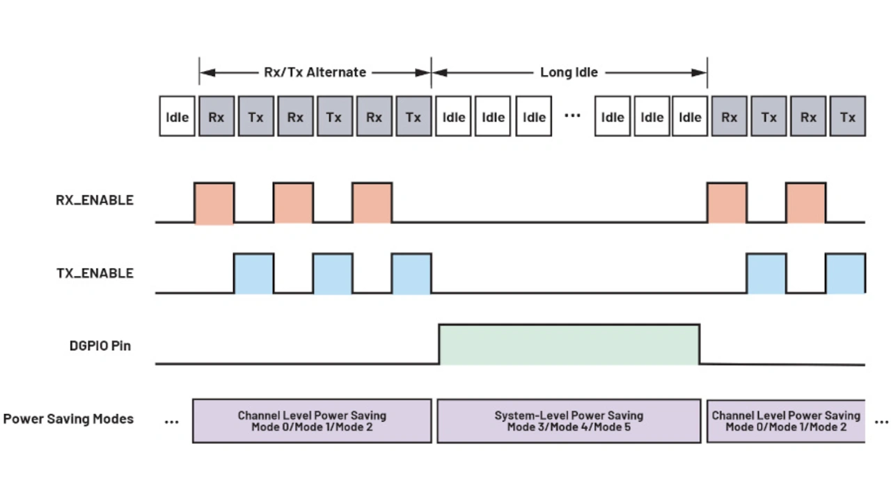 Anders als bei Energieeinsparungen auf Kanalebene, müssen die Energieeinsparungen auf Systemebene über einen DGPIO-Pin getriggert werden. Bild 8 zeigt ein Beispiel, wie Entwickler eine kombinierte Energieeinsparung auf Kanal- und Systemebene während unterschiedlicher Zeiten in einer TDD-Anwendung nutzen können, um eine höhere Energieeinsparung zu erzielen. In diesem Beispiel alternieren in dieser Zeitspanne der Sende- und der Empfangsbetrieb und der Anwender kann über die RX_ENABLE- und TX_ENABLE-Signale die bestmögliche Energieeinsparung auf Kanalebene auswählen.