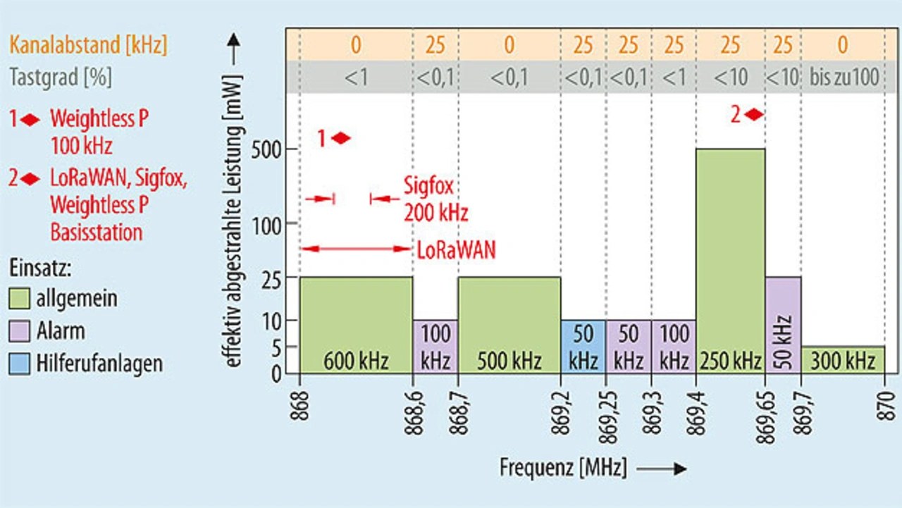 Der Bereich von 868,7 MHz bis 869,2 MHz ist in der Praxis nicht so interessant, weil dort der Tastgrad auf 0,1 % festgelegt wurde (Bild 2). LoRaWAN nutzt im allgemeinen drei Kanäle mit 125 kHz Bandbreite und benötigt durch seinen Abstand zwischen den Kanälen in Summe 600 kHz Bandbreite. Sigfox nutzt 200 kHz und Weightless benötigt 100 kHz für acht Kanäle im Frequenzmultiplexverfahren (FDMA, Frequency-Division Multiple Access).