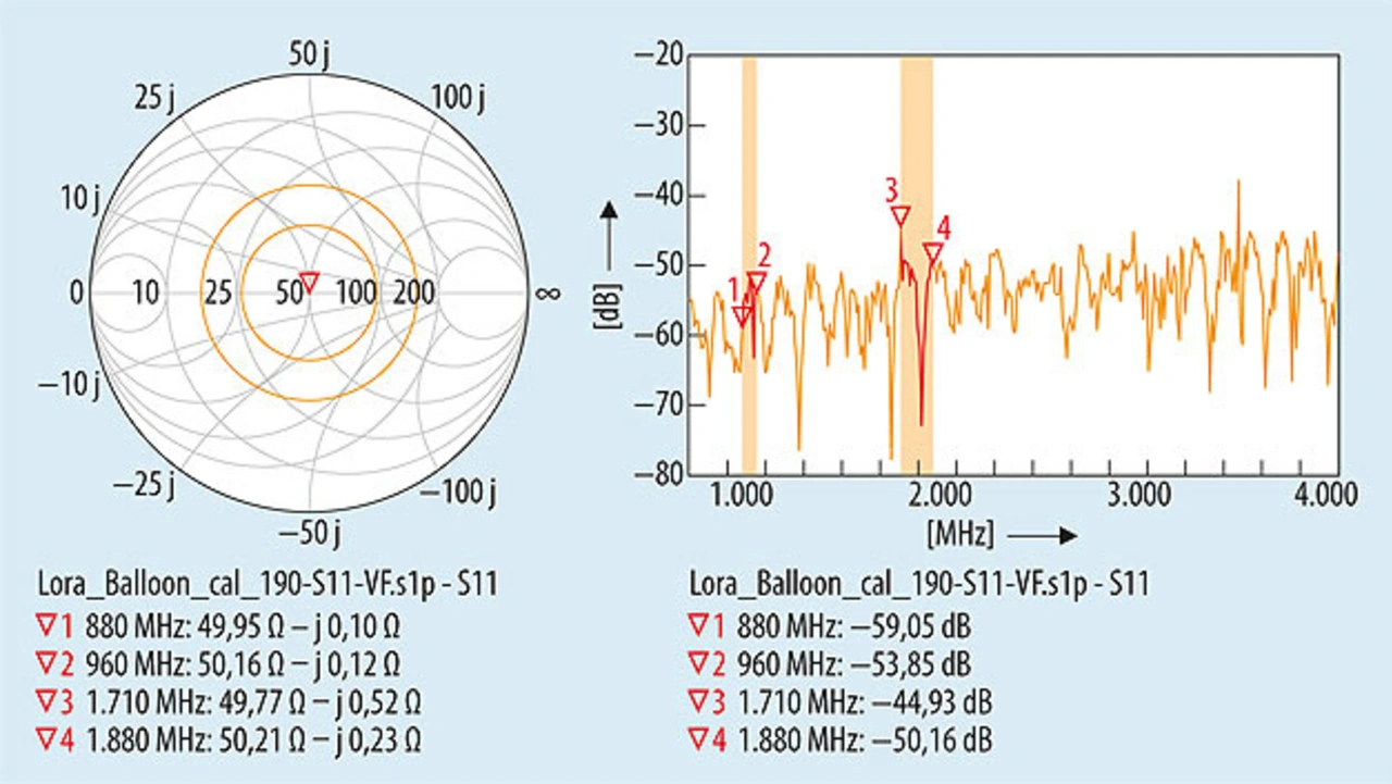 Das andere Diagramm in Bild 5, rechts, zeigt die Rückflussdämpfung des 50-Ω-Widerstandes im gleichen Frequenzbereich. Er liegt im Mittel deutlich unter –50 dB und damit weit entfernt von den angestrebten –17 dB Rückflussdämpfung der zu vermessenden LPWAN-Antenne. Über Marken lassen sich die interessierenden Frequenzbereiche auswählen – in Bild 5 farblich markiert.
