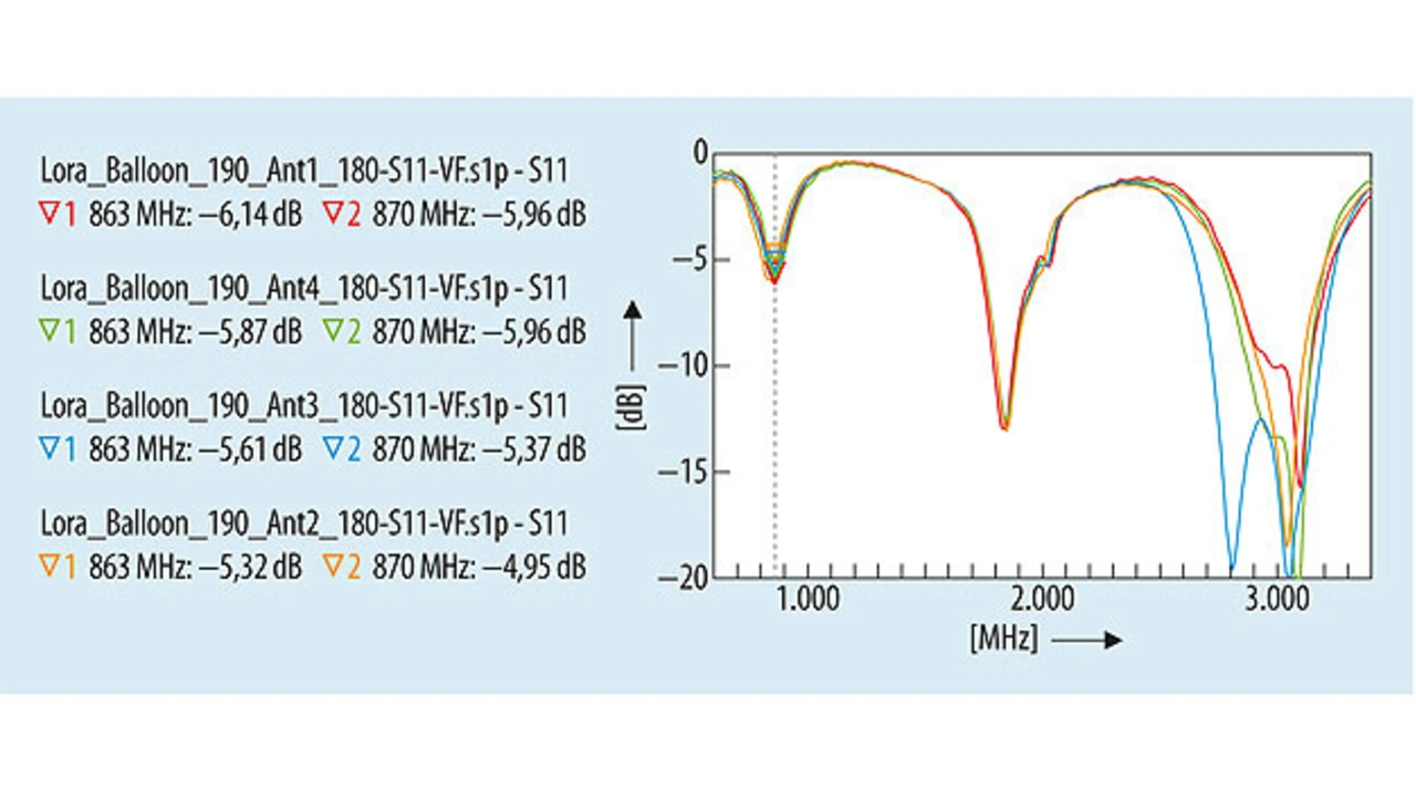 Bei der ersten Messung werden die vier Antennen im Frequenzbereich von 600 MHz bis 4 GHz vermessen (Bild 6). Der Bereich oberhalb von 3.400 MHz wurde mit der Software zur Visualisierung (Atyune) beschnitten. Alle Messwerte, gemessen wurde in 100-kHz-Schritten, wurden in einer Datei gespeichert, um die Messdaten für spätere Analysen zu archivieren.