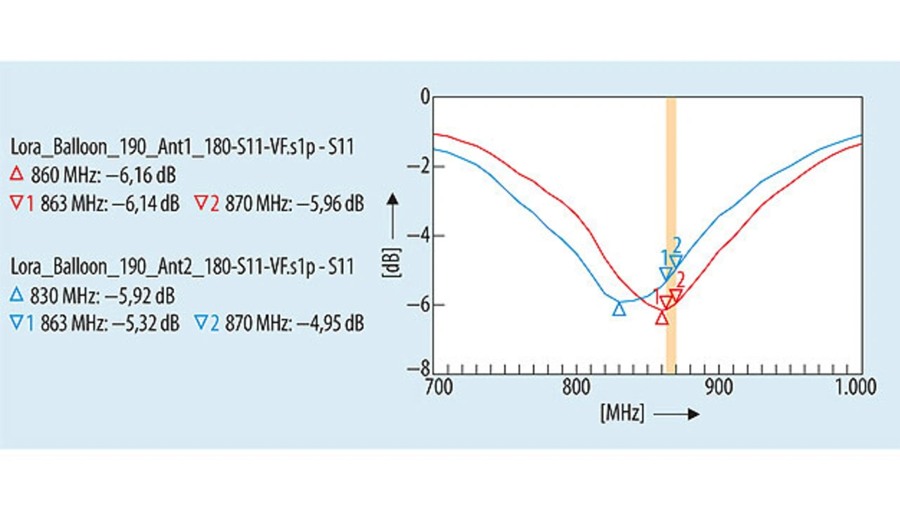Zwei Fehler zeigen sich deutlich: Weder Antenne 1 noch Antenne 2 weisen eine Rückflussdämpfung von –17 dB auf. Beide sind im interessierenden Frequenzbereich (farblich markiert) mindestens 11 dB vom Datenblattwert entfernt. Hinzu kommt, dass beide Antennen ihren Spitzenwert nicht im markierten Bereich von 863 MHz bis 870 MHz haben.