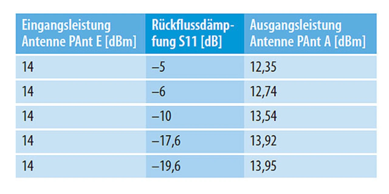 Wenn diese Antennen mit einem SRD-Transceiver zum Einsatz kommen, dann fehlen unter der Berücksichtigung von τ = 1 – S112 ca. 1,65 dB bei der abstrahlten Leistung. Der Parameter τ gibt an, wie viel Energie die Antenne vom Sender annimmt PAnt A = PAnt E× τ (Tabelle 1). Die Rückflussdämpfung S11 geht quadratisch in das Ergebnis mit ein. Dieser Zusammenhang zeigt, dass zwischen einer Rückflussdämpfung von –5 dB und –17,6 dB ein Delta in der abgestrahlten Leistung (PAnt A) von 13,92 dBm – 12,35 dBm = 1,57 dB entsteht.