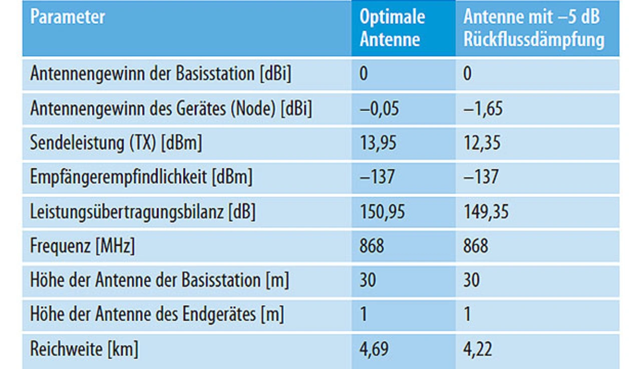 Für eine Beispielrechnung wird die Höhe der Antenne für die Basisstation (hS) auf 30 m festgelegt. Für das mobile Endgerät (Node) wird eine Höhe (hE) von 1 m angenommen. Die reduzierte Sendeleistung durch eine Rückflussdämpfung von –5 dB wurde in der Leistungsübertragungsbilanz (Link Budget) mit einer Reduzierung von –1,65 dB eingerechnet (Tabelle 2).