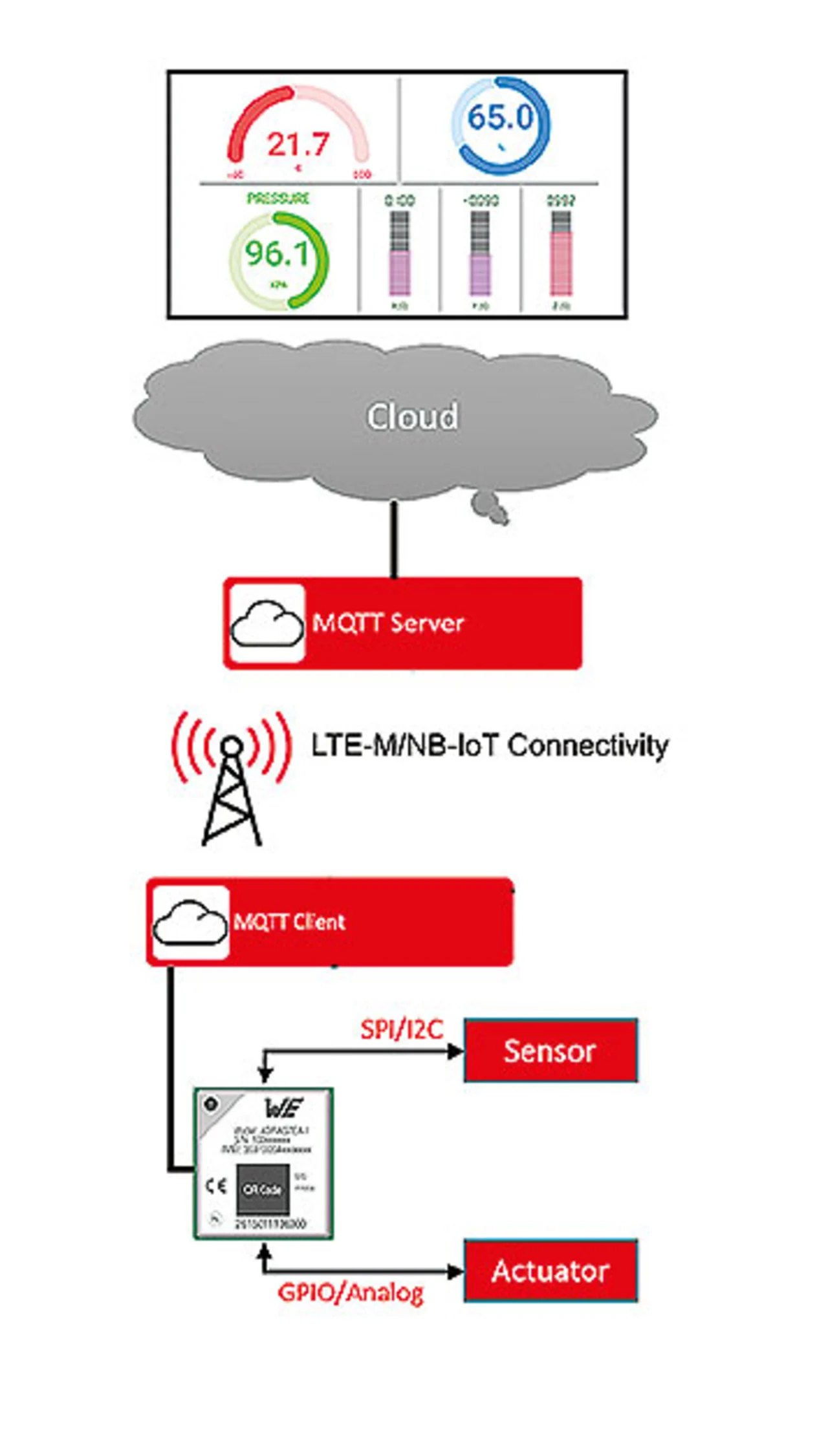 Im Modul ist ein MQTT-Client implementiert, sodass eine Verbindung zu einem MQTT-Server (Broker) in einer Cloud relativ einfach ohne ein Gateway herzustellen ist. Bekanntermaßen gibt es zahlreiche Cloud-Plattformen, wobei AWS (Amazon Web Services) und Microsofts Azure die bekanntesten sind, die ausschließlich die empfehlenswerte Secure Version von MQTT mit Authentifizierung und End-to-End-Verschlüsselung unterstützen.