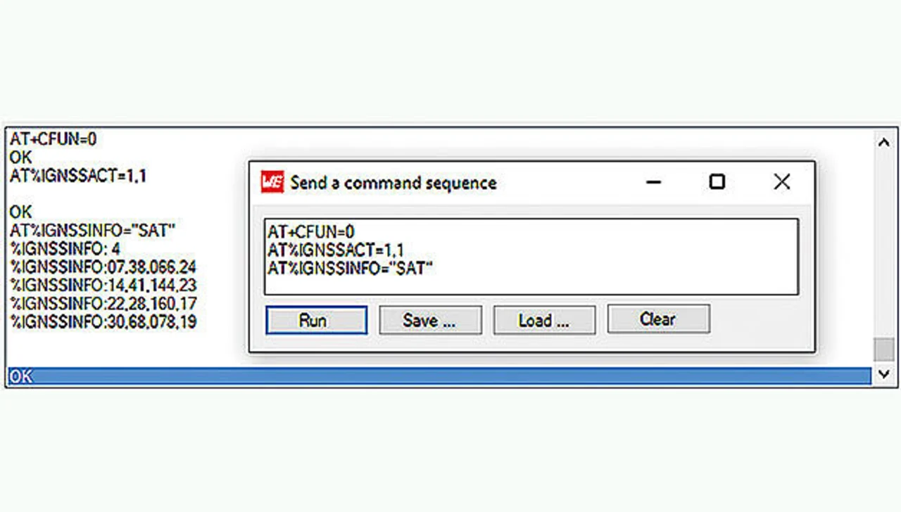 Um den Standort der Sensoren und Aktoren eines LPWAN-Boards lokalisieren zu können, ist die Elektronik für eine satellitengestützte Positionsbestimmung (GNSS) im Modul integriert, was die Nutzung der GPS- und GLONAS-Satelliten ermöglicht. Eine zeitgleiche Verwendung von LTE-M/NB-IoT und GNSS schließt sich aus technischen Gründen aus. Die LTE-Kommunikation hat eine höhere Priorität als GNSS, sodass GNSS automatisch abgeschaltet wird, wenn LTE aktiv ist. Deshalb muss zunächst LTE mit AT+CFUN=0 deaktiviert und der Satellitenempfang mit AT%IGNSSACT=1,1 aktiviert werden, um die aktuellen Satteliteninformationen mit AT%IGNSSINFO=“SAT“ zu empfangen (Bild 5).