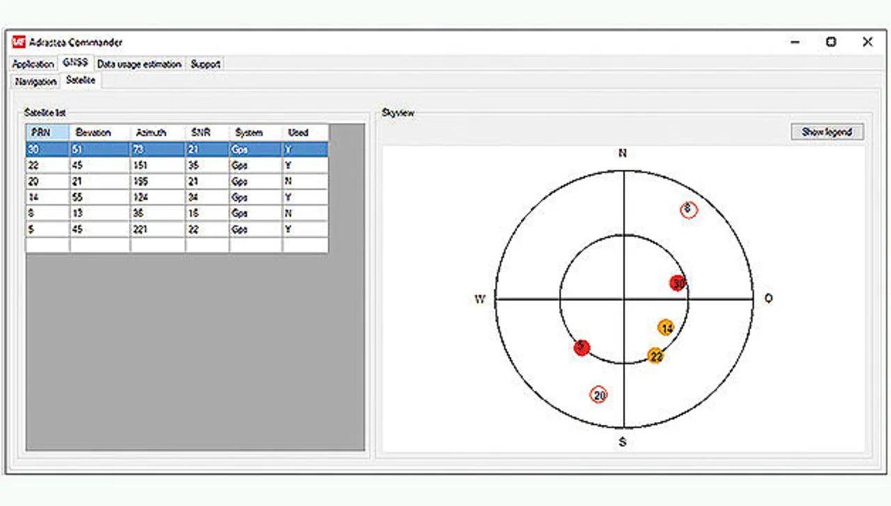 werden die von den GPS-Satelliten ausgesendeten NMEA Messages empfangen und angezeigt, was auch die Visualisierung der jeweiligen Satellitenpositionen (Bild 6) erlaubt.