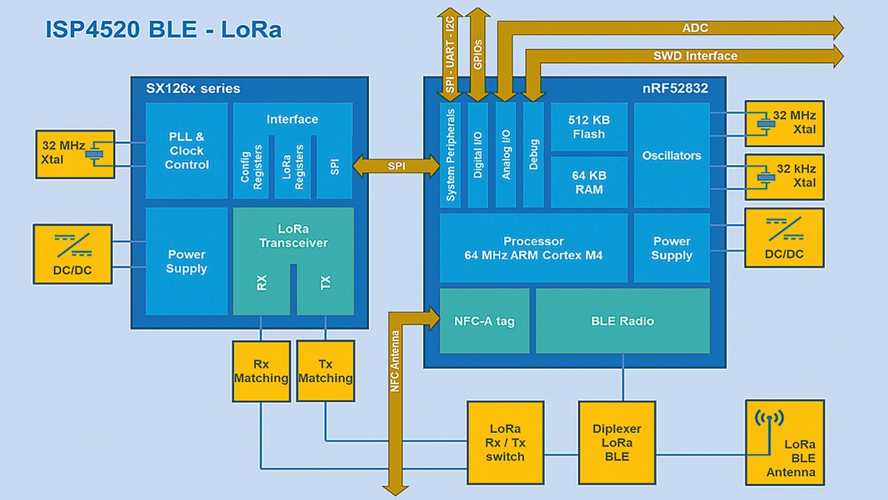 Was ist mit dem Fall, dass zwei Funktransceiver eingesetzt werden sollen, die in verschiedenen Frequenzbändern arbeiten? Solche Anforderungen sind relativ häufig, um von den unterschiedlichen Eigenschaften von Funksystemen zu profitieren, die in verschiedenen Bereichen des Spektrums arbeiten. Dies wäre beispielsweise der Fall bei einem Bluetooth-Transceiver mit kurzer Reichweite, der zusammen mit einem Transceiver mit niedrigerer Datenrate und langer Reichweite, z. B. LoRa, in einem System arbeitet.