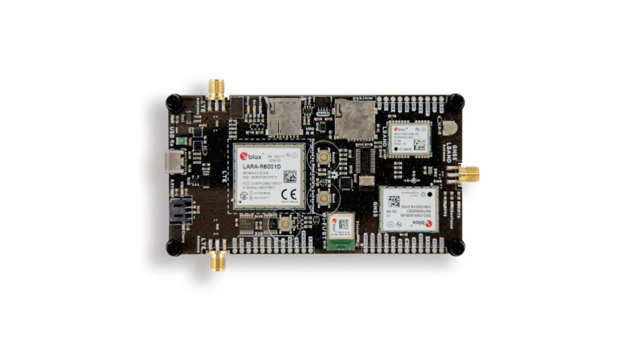 Das Entwicklungskit XPLR-HPG-2 (Bild 2) enthält alle Bausteine in einem kompakten Modul, das RTK-GNSS-Modul ZED-F9R, das LARA-R6001D LTE Cat 1 mit integriertem MQTT-Client und den L-Band-Korrekturdaten-Empfänger NEO-D9S sowie das Modul NINA-W106 mit Mikrocontroller und Transceivern für Bluetooth LE und Wi-Fi.