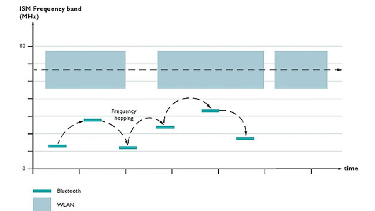 Eine generelle Stärke von Bluetooth liegt in der guten Koexistenz mit anderen Funksystemen. Durch den ständigen schnellen Wechsel zwischen den Funkkanälen erscheint das Bluetooth-System für die anderen Funksysteme weniger als aktiver Funksender, sondern als geringes Hintergrundrauschen.