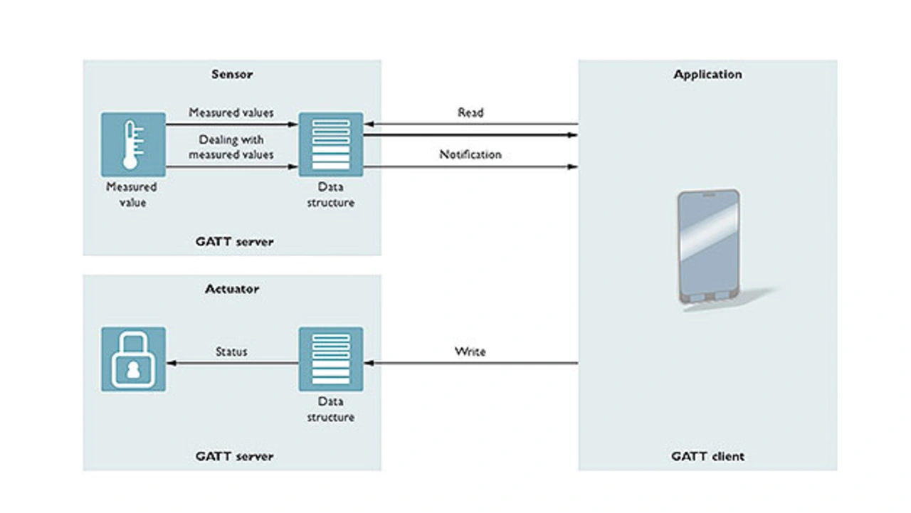Im Gegenzug können Aktoren ebenfalls als GATT-Server arbeiten und mit Daten von einer Applikation beschrieben werden (Write-Funktion). Das erlaubt zum Beispiel das Ein- und Ausschalten einer Warnleuchte oder Öffnen eines Schlosses – je nachdem, welche Funktionen das Endgerät physikalisch sowie in der GATT-Datenstruktur anbietet (Bild 3).