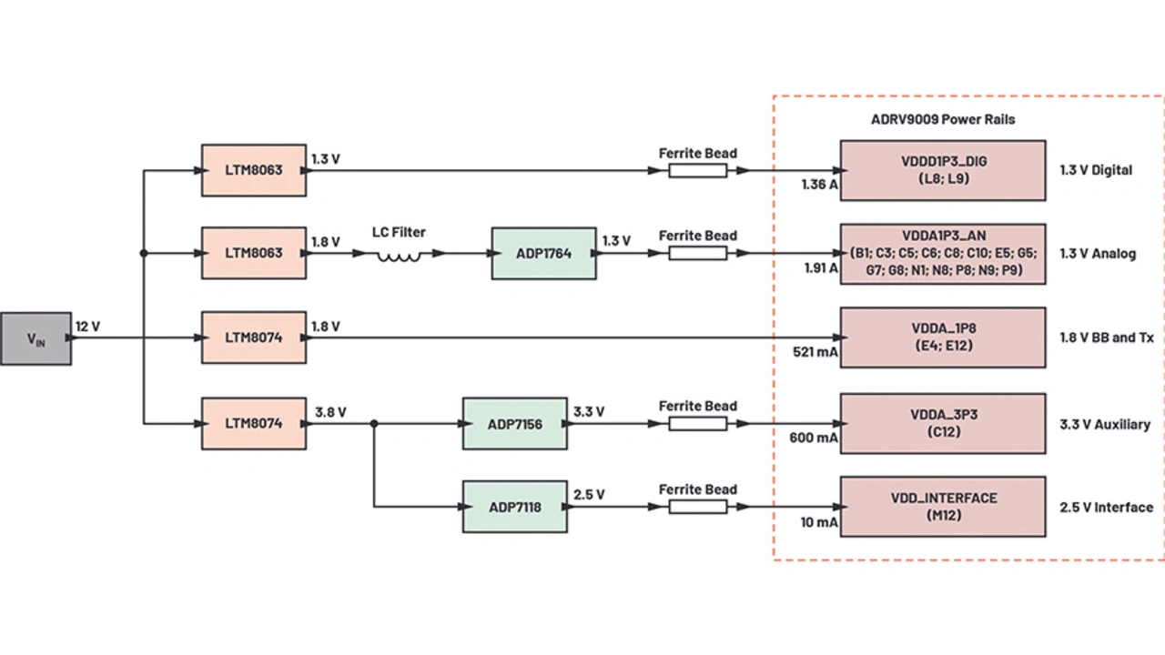 Basierend auf den Ergebnissen der durchgeführten Tests wurde eine optimierte Stromversorgung für den Transceiver-IC ADRV9009 entworfen (Bild 7), die einen Spielraum von >6 dB schafft, wenn sie auf einem ADRV9009-Transceiver-Modul eingesetzt wird.