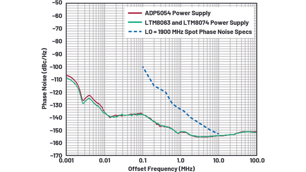 Die optimierte Stromversorgung in Bild 7 wurde mit der Referenz – einer Entwickler-Version des ADRV9009-Evaluierungsmoduls, nämlich des Evaluierungsmoduls AD9378 mit einer Stromversorgung wie in Bild 1 dargestellt – verglichen. Die gleiche Baugruppe wurde benutzt, aber mit der optimierten Stromversorgung aus Bild 7, wobei die Ergebnisse des Phasenrauschens miteinander verglichen wurden. Idealerweise erfüllt die optimierte Stromversorgung die Referenz-Diagramme im Datenblatt oder übertrifft sie sogar.