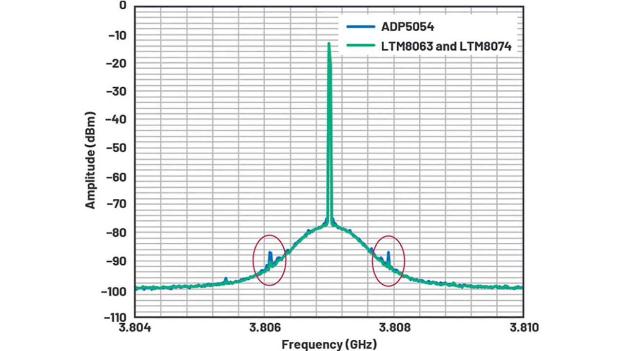 Bild 8 zeigt die Ergebnisse der Vergleichsmessung mit dem AD9378-Evaluierungsmodul, einmal mit der auf dem ADP5054 basierenden Standard-Stromversorgung, verglichen mit den Ergebnissen der gleichen Baugruppe mit einer optimierten Stromversorgung (Bild 7) auf Basis der Gleichspannungswandler LTM8063 und LTM8074. Die Stromversorgung mit den einzelnen µModule-Abwärtswandlern hat im Vergleich zur ADP5054-basierten Stromversorgung eine geringfügig bessere Leistung von rund 2 dB.