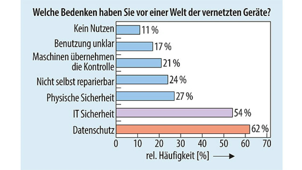 Die Sicherstellung des Datenschutzes und der Sicherheit sind elementare Grundvoraussetzungen für den Erfolg von Anwendungen im Internet und insbesondere im Internet der Dinge. Eine 2016 vom Mobile Ecosystem Forum durchgeführte Umfrage [1] unterstreicht dies. 60 % der Befragten äußerten sich beunruhigt über eine Welt der vernetzten Geräte. Hauptpunkte waren Sicherheit und Datenschutz (Bild 1).