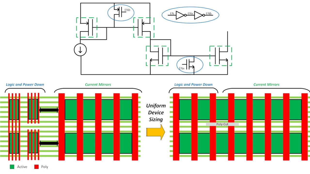 Der gleiche Ansatz bei FinFET führt zu unregelmäßigen Mustern für kritische Masken wie Poly und aktiver Bereich. Der Layouter ist außerdem gezwungen, zusätzliche Regeln für die Abstände zwischen Bauelementen unterschiedlicher Länge einzuhalten. Weisen hingegen die Abschalttransistoren die gleiche Länge der Stromspiegel auf, wird das Layout regelmäßig. Dies maximiert die Layout-Effizienz und hält die Dichte der kritischen Schichten konstant. Somit lassen sich Vorlagen erstellen, die für mehrere Analogblöcke wiederverwendet werden können.