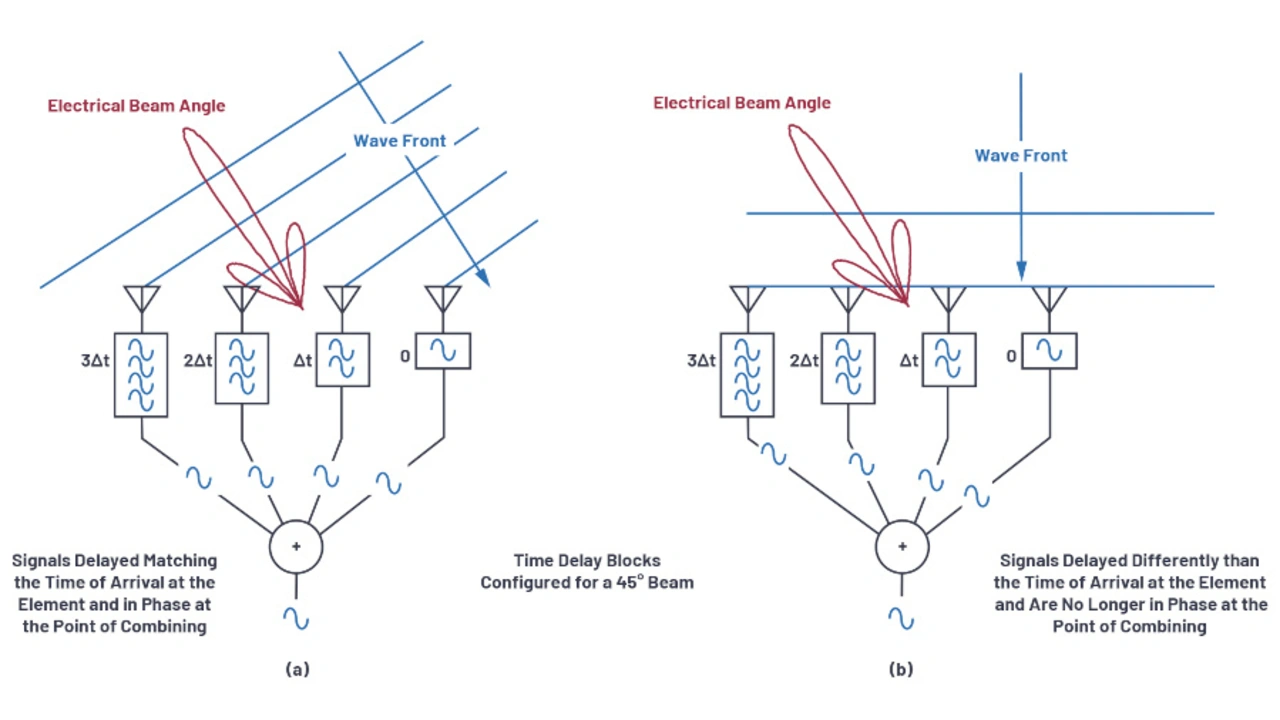In Bild 1a entspricht diese Zeitverzögerung der Zeitdifferenz der auf jedes Element auftreffenden Wellenfront. In diesem Fall bewirkt die Verzögerung, dass die vier Signale am Summationspunkt phasengleich ankommen. Die Addition der Signale führt zu einem stärkeren Signal am Ausgang des Addierers.