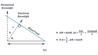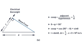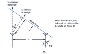 Bild 3a definiert die Trigonometrie zwischen diesen Elementen, wobei jedes Element durch einen Abstand d getrennt ist. Der Strahl wird in eine Richtung weg von der Hauptrichtung θ gerichtet, was einem Winkel φ vom Horizont aus entspricht. Bild 3b zeigt, dass die Summe von θ + φ = 90 ° ist. Dies erlaubt es, die Delta-Distanz der Wellenausbreitung L als L = dsin(θ) zu berechnen. Die Zeitverzögerung zur Steuerung des Strahls entspricht der Zeit, die die Wellenfront benötigt, um diese Entfernung L zurückzulegen. Wird L als ein Bruchteil der Wellenlänge betrachtet, dann könnte diese Zeitverzögerung durch eine Phasenverzögerung ersetzt werden. Die Gleichungen für ΔΦ können dann relativ zu θ definiert (Bild 3c) werden, wie in Gleichung 1 dargestellt.