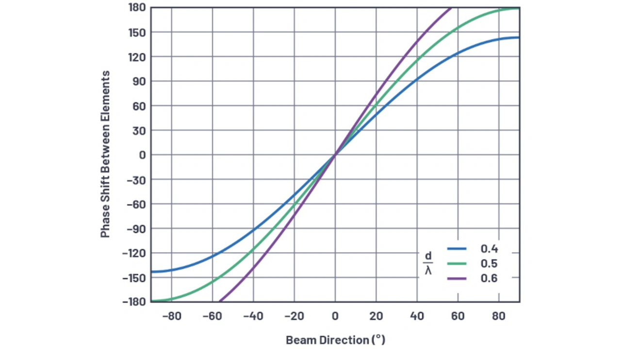 Zum besseren Verständnis, wie sich die Phasenverschiebung mit der Strahlrichtung (θ) verändert, sind die Gleichungen in Bild 4 für eine Vielzahl von Bedingungen dargestellt. Aus den Diagrammen lassen sich interessante Beobachtungen ableiten. Für den Fall von d = λ/2 gibt es eine ungefähre Steigung von etwa 3 zu 1 in der Nähe der Ausbreitungsrichtung, was dem Multiplikator von π in Gleichung 2 entspricht. Dieser Fall zeigt auch, dass eine vollständige Phasenverschiebung um 180 ° zwischen den Antennenelementen eine theoretische Verschiebung von 90 ° in der Strahlrichtung ergibt.