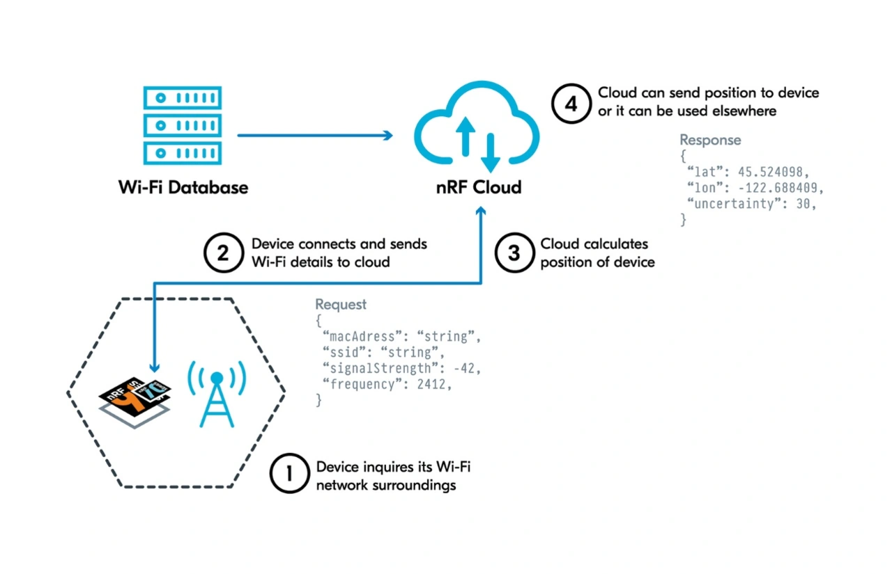 WiFi-Lokalisierung lässt sich auch für Asset-Tracking nutzen. Dazu müssen Entwickler den nRF9151 oder andere SiPs der Serie nRF91 mit dem WiFi-Companion-IC nRF7000 von Nordic kombinieren. Bei der WiFi-Lokalisierung fragt der nRF7000 jeden nahegelegenen WiFi-Access-Point (AP) nach dessen Service Set Identifier (SSID) ab. Der nRF9151 leitet die SSID dann über NB-IoT oder LTE-M an die nRF Cloud weiter. Diese prüft dann eine oder mehrere WiFi-SSID-Datenbanken und gibt den SSID-Standort sowie den Grad der Unsicherheit für diesen Standort an eine Benutzerschnittstelle, z. B. ein Smartphone, zurück (Bild 2).