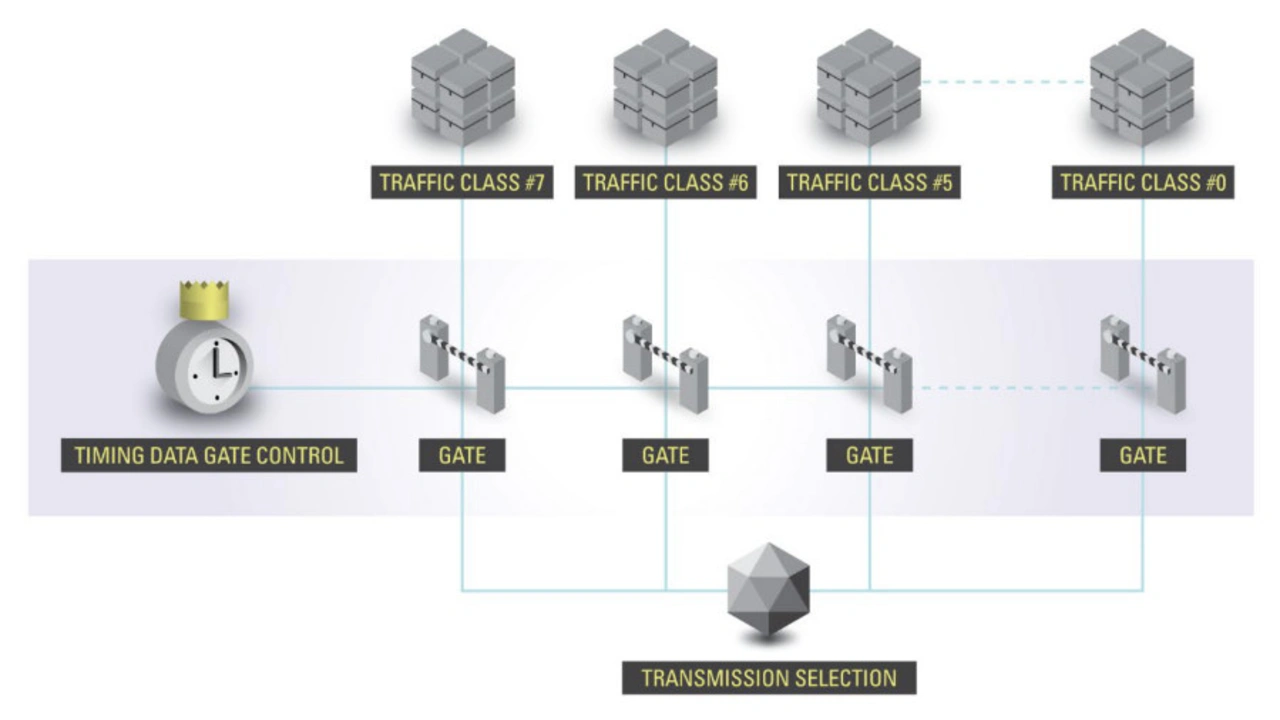 Die Gestaltung des Datenverkehrs ist eine weitere wichtige Funktion für Funksysteme und die Anforderungen werden durch die Standards 802.1Qbv (time-aware shaper) oder 802.1Qav (credit-based shaper) erfüllt. Die Wahl des Traffic-Shapers hängt vom Anwendungsfall ab. Der 802.1Qbv-Standard definiert eine Reihe von zeitgesteuerten Gates zur Steuerung der Warteschlangen, die mit mehreren Verkehrsklassen auf einer TSN-Brücke verbunden sind (Bild. 1).