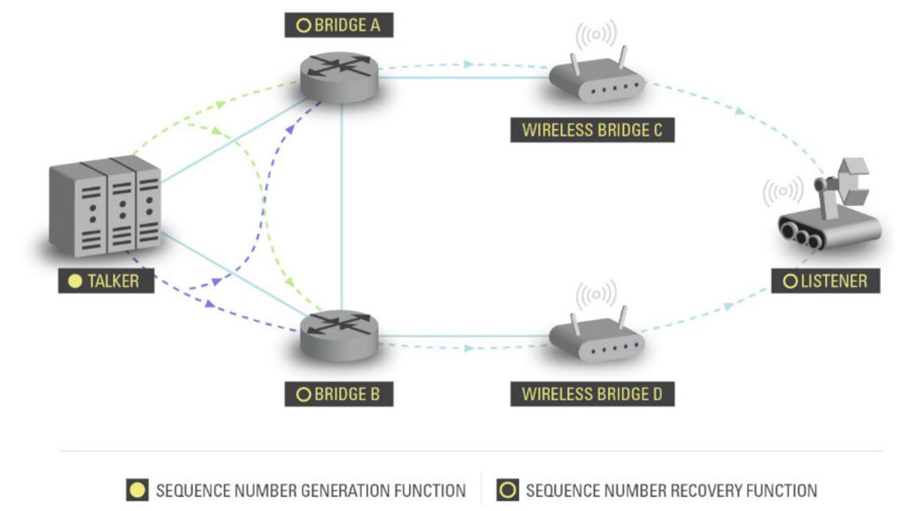 Der 802.1CB FRER-Dienst ist für die zugrundeliegende MAC/PHY-Verbindung transparent und sollte, wie in Bild 2 dargestellt, über Funkverbindungen betrieben werden können, aber die Implementierung kann je nach spezifischer Funktechnik variieren. Es wird erwartet, dass 802.1CB verwendet wird, wenn die Anwendung ein extrem hohes Maß an Zuverlässigkeit erfordert und Redundanz sowohl bei Geräte- als auch bei Verbindungsausfällen erforderlich ist.