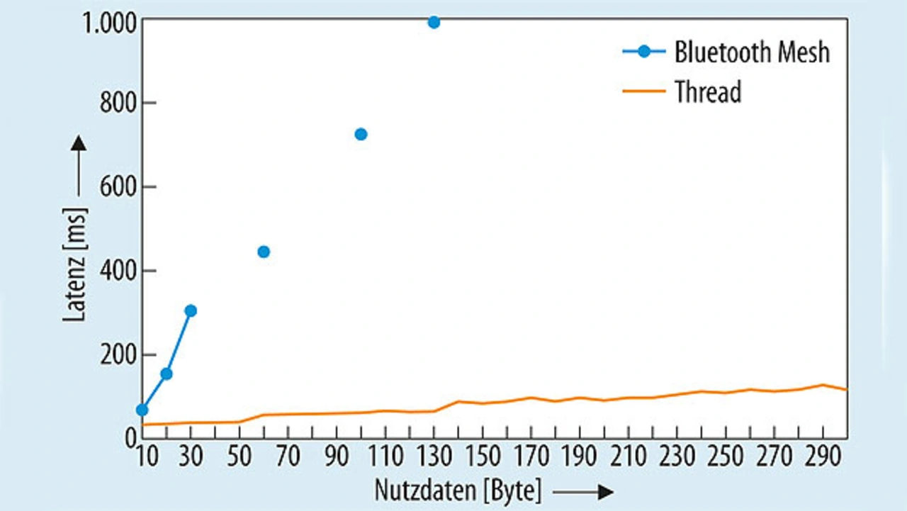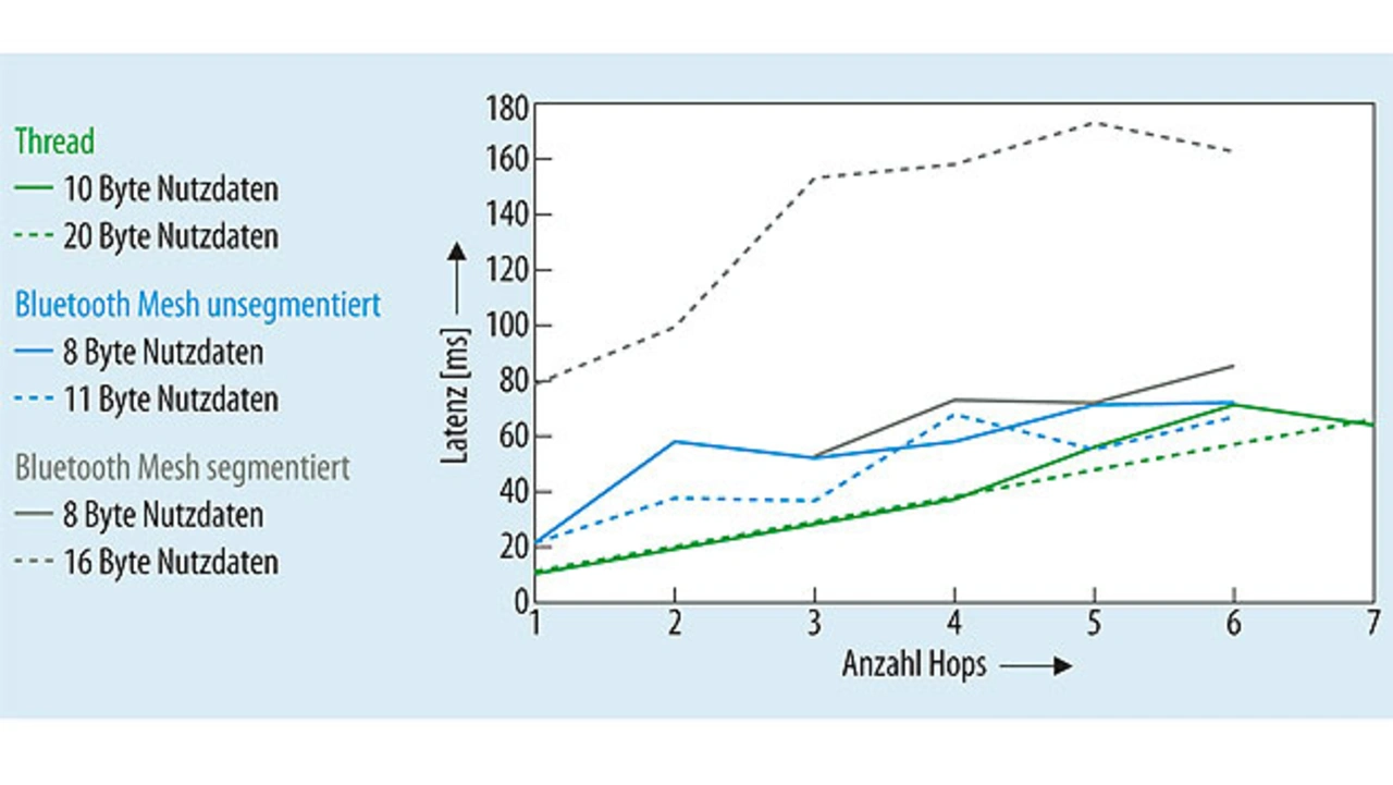 Bild 6 zeigt die durchschnittliche Latenzzeit pro Hop für ein Thread-Netzwerk im Vergleich zu unsegmentierten und segmentierten Bluetooth-Mesh-Paketen. Zigbee-Daten wurden nicht separat eingezeichnet, da sie Thread ähnlich sind. In diesem Diagramm ist zu erkennen, dass bei kleineren Nutzdaten die Latenz bei unsegmentiertem Bluetooth und Thread bei bis zu sechs Hops sehr ähnlich ist.