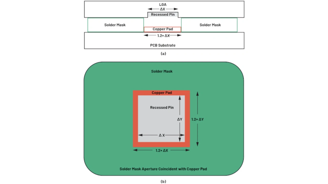 Um die Auswirkungen von Leiterplatten- und IC-Gehäusetoleranzen zu minimieren, wird empfohlen, bei der Leiterplattenbestückung von LGA-IC-Gehäusen die im Folgenden aufgezählten Richtlinien anzuwenden. Die genannten Regeln eignen sich für LGAs mit 0,25 mm großen Anschlüssen (quadratisch oder rechteckig) in einem Raster von 0,5 mm sowie für vergleichbare Geometrien.