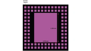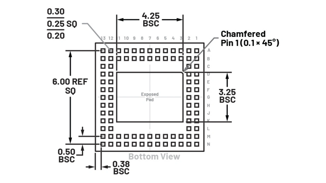 Der ADAR1000 ist in einem 7 mm × 7 mm großen LGA-Gehäuse untergebracht, seine Anschlüsse sind in Form zweier konzentrischer Quadrate angeordnet und in der Mitte befindet sich zusätzlich eine herausgeführte Massefläche (Bild 7). Die Abmessungen jeder Anschlussfläche betragen 0,25 mm × 0,25 mm bei einer Toleranz von ±0,05 mm. Die Massefläche hat eine nominelle Größe von 4,25 mm × 3,25 mm. Nicht dargestellt in Bild 7 ist die Vertiefung der Pads von 0,02 mm.