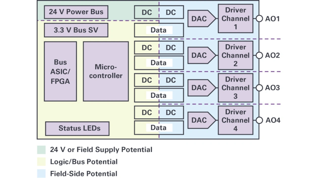 In der Prozessautomation besteht oft zusätzlich die Forderung nach einer galvanischen Trennung zwischen den Ausgangskanälen. Hinzu kommen weitere Bedingungen wie zum Beispiel kanalbasierte Diagnose oder Unterstützung von HART-Signalen (Highway Addressable Remote Transducer). Hohe Robustheit und geringe Fehlertoleranz sind ebenfalls Grundvoraussetzungen.