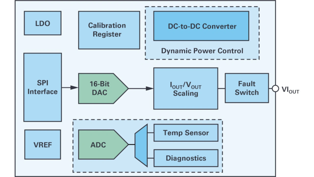 Die DPC-Funktion regelt nun die Treiberspannung auf wenige Volt über der tatsächlich benötigten Lastspannung – die minimale Reserve für den Betrieb des Ausgangstransistors – und sorgt so für eine nur minimale thermische Verlustleistung. Eine Anpassung der Spannung mit hohem Wirkungsgrad ist auf diese Weise nur über einen Abwärtsschaltregler möglich, der bereits im AD5758 integriert ist und dessen Ausgangsspannung automatisch lastabhängig geregelt wird.