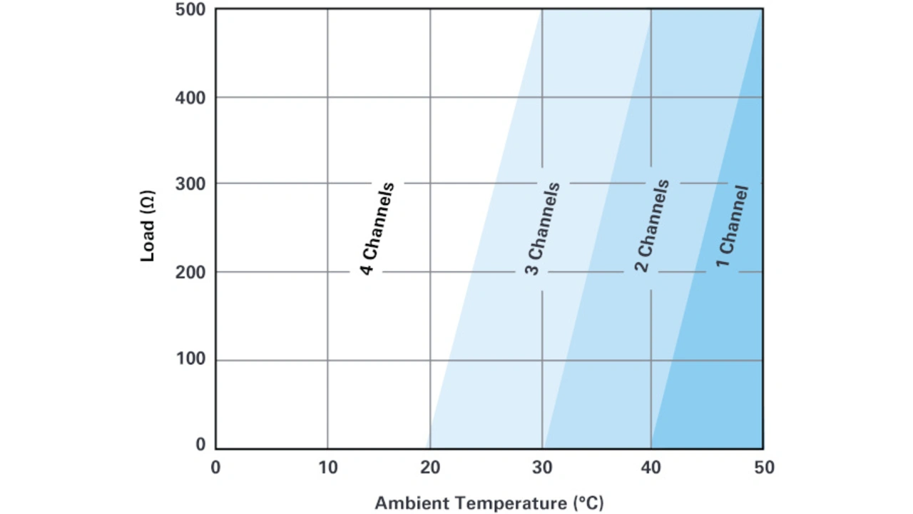 Derating ist definiert als eine Verringerung der elektrischen Leistung unter definierten Randbedingungen, ähnlich der Betrachtung des sicheren Betriebsbereichs (SOA) bei Leistungshalbleitern. Aufgrund der bereits erwähnten Leistungsverluste und der damit verbundenen Kühlprobleme sind den Ausgangsmodulen ohne DPC enge thermische Grenzen gesetzt. Heute sind zwei oder vier Kanäle auf einem Modul mit den Abmessungen einer Kreditkarte üblich. Die Module sind in der Regel für Umgebungstemperaturen von bis zu 60 °C spezifiziert.