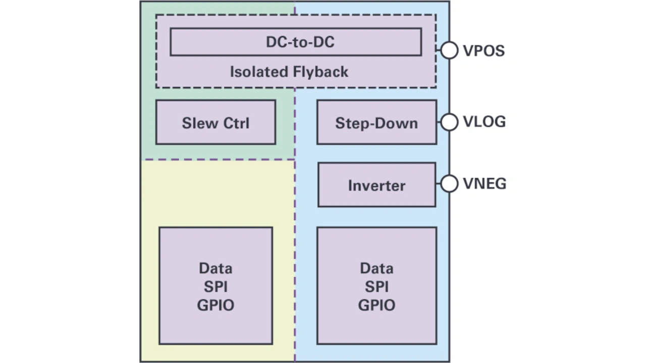 Die galvanisch trennende SPI-Schnittstelle basiert auf der bewährten iCoupler-Technik von Analog Devices. Sie überträgt alle für den Betrieb erforderlichen Steuersignale. Dabei wird zwischen einem Pfad mit vier Kanälen für die schnelle Übertragung von SPI-Daten und einem langsameren Pfad – drei Kanäle im Multiplex-Verfahren – für die Steuerung von GPIOs unterschieden. Mögliche Anwendungen sind die synchrone Aktivierung der Ausgänge in mehrkanaligen Modulen oder modulübergreifend über ein gemeinsames Steuersignal, das Rücklesen eines Fehlerflags oder das Auslösen einer Sicherheitsabschaltung.