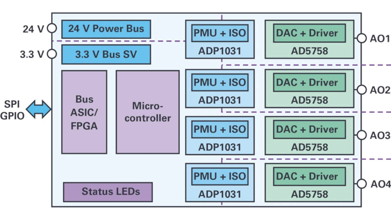 Speicherprogrammierbare Steuerungen (SPS) verfügen über eine Vielzahl von analogen und digitalen Ein- und Ausgängen zum Überwachen und Steuern von Industrie- und Produktionsprozessen. Modulare Konzepte sind weit verbreitet und decken in Bezug auf Ein- und Ausgänge (E/As) die Grundfunktionen von analogen und digitalen E/As ab. Der Analogausgang stellt eine besondere Herausforderung dar. Denn es muss ein Sollwert aktiv und mit hoher Genauigkeit unter verschiedenen Lastbedingungen getrieben werden (Bild 1). Die aktive Treiberstufe ist hier wichtig und Verluste sollten so gering wie möglich gehalten werden.